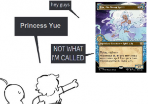 I'm talking about the pre-mooned version, not the post-moon version depicted in Yue, the Moon SpiritYue, the Moon Spirit. This set has several variants of the same character, so it's important to be specific when referencing legendary creatures in particular.