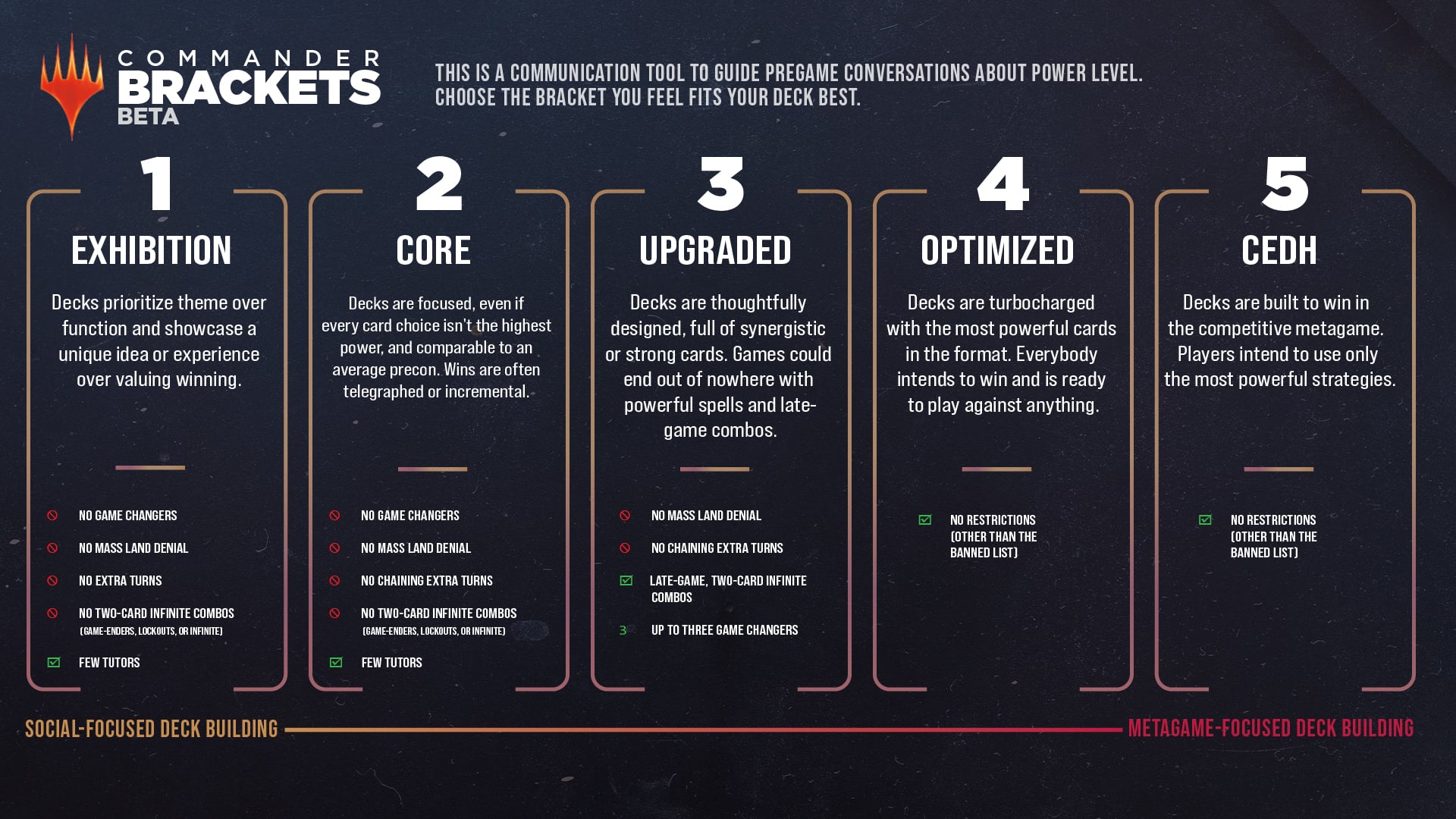 "Decks are thoughtfully designed, full of synergistic or strong cards. Games could end out of nowhere with powerful spells and late-game combos." It forbids mass land denial and chaining extra turns while allowing specifically late-game two-card infinite combos. Notably, the stipulation of "few tutors" disappears in Bracket 3, which we assume means that tutors are good to go in the bracket as long as they aren't Game Changers that surpass the amount you're allowed to have to remain in this bracket. Up to three Game Changers are allowed, but this isn't important here.