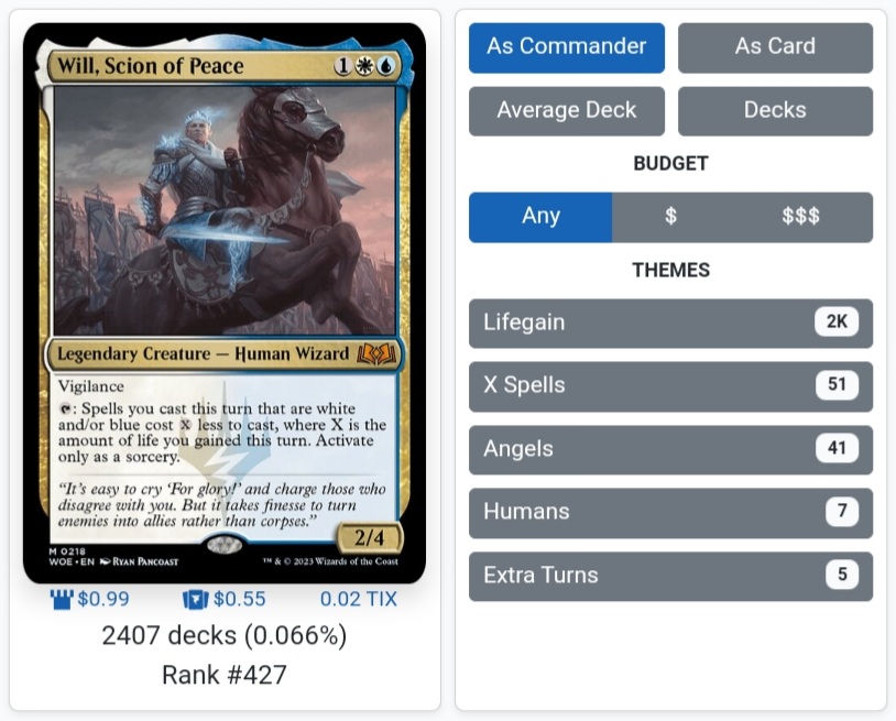 Other commanders swear fealty to a single type or mechanic, and their EDHREC data leans heavily into a single theme. Kenrith might be the king of variety, but his son, Will, Scion of PeaceWill, Scion of Peace, is a poster boy for singular focus. Will commands over 2400 decks on EDHREC, and at least 2000 of those are Lifegain decks. The next most popular theme for Will, Scion of Peace is X Spells, with a scant 51 decks.