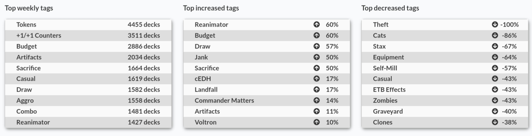 You can see deck building trends for tags in Archidekt's Community Stuff.