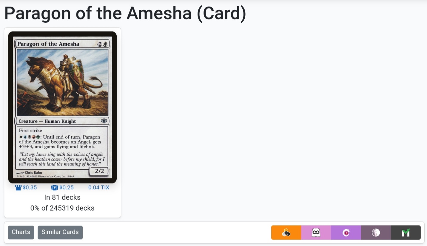 Looking at the next screenshot, there's a big blank void where the Theme information would be on a commander page. I had to look elsewhere, starting with the top commanders for Paragon of the Amesha.