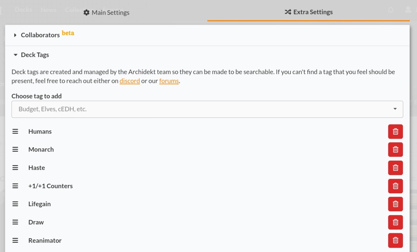 Archidekt creates tags for users to assign to their decks. You can tag your own decks in the Extra Settings by clicking the pen-shaped edit button next to the Tags icon at the top of the deck page. Archidekt tags are searchable to help other members of the community looking for inspiration, and tags help EDHREC publish more accurate data. Archidekt also publishes internal site data about tags in Community Stuff.