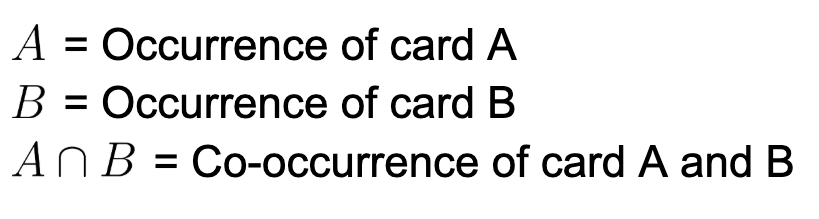 D sub A: number of decks containing card A. D sub A given Color⁺ of A intersect B: number of decks containing card A within the potential deck color identities of A and B. D sub Color⁺ of A intersect B: total number of decks within the potential deck color identities of A and B.