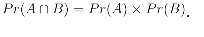 Pr of A intersect B equals Pr of A multiplied by Pr of B. This expresses the condition for A and B being independent events.