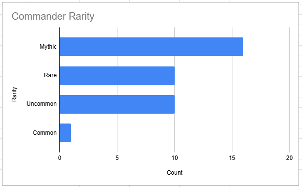 Unsurprisingly, there are exactly 25 multicolor legends, evenly split between the five colors of the Strixhaven schools; that sort of graph is boring so I'm skipping it.