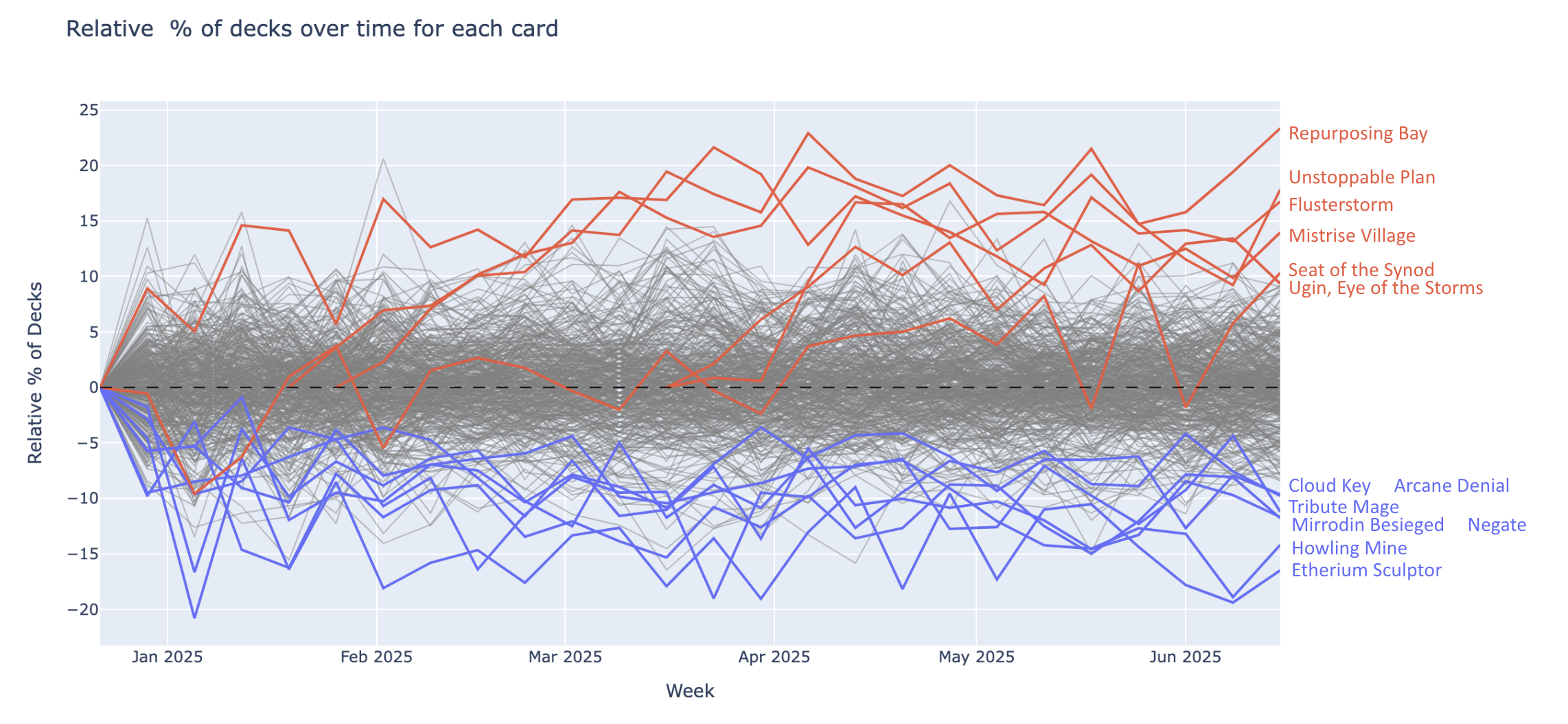 Cards that are either significantly increasing or decreasing in usage with a given commander relative to other cards played with that commander over the most recent six months.
