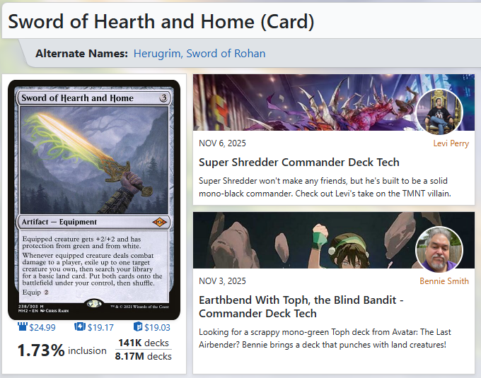 Oh look, there's another one of my articles recommended next to the sword! EDHREC has Sword of Hearth and HomeSword of Hearth and Home, with protection from Selesnya () colors at #2.
