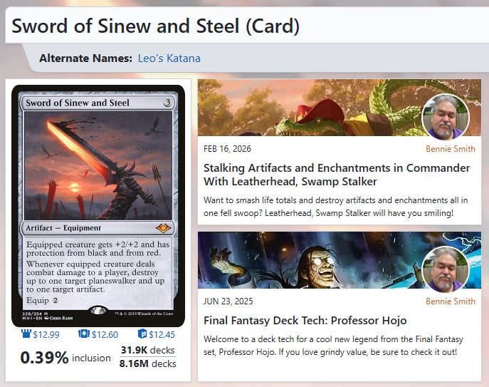 EDHREC has Sword of Sinew and SteelSword of Sinew and Steel ranked at #10. Oh hey, when you pull it up two of my articles are suggested. How cool!