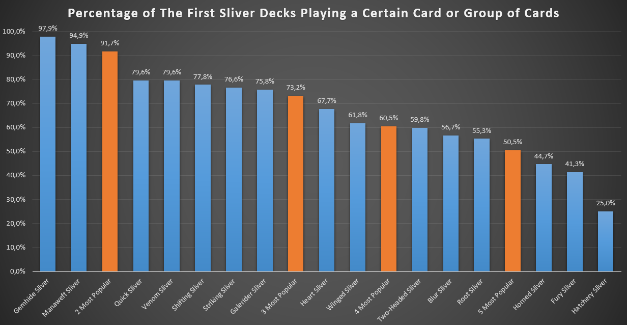 First off, I took into consideration the first group of Slivers mentioned in this article, which is to say those that we aren't really going to copy. What's really striking is the presence of a solid core of Sliver cards that are almost always present: Gemhide SliverGemhide Sliver and Manaweft SliverManaweft Sliver are basically auto-includes, standing at 98 and 95% inclusion rate respectively. Moreover, almost 92% of The First SliverThe First Sliver decks run both of them in the 99. Nonetheless, this core is effectively wider, as 73.2% of the decks include the three most popular Slivers (thus including Quick SliverQuick Sliver as well), 60.5% play Venom SliverVenom Sliver as well, and 50.5% decided to include the up-to-the-fifth most popular Sliver, which is Shifting SliverShifting Sliver.
