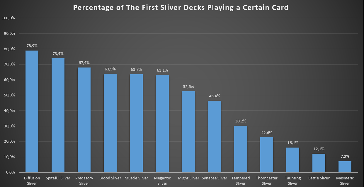 On the other hand, only a few creatures don't see play in the majority of the decks: Horned SliverHorned Sliver hovers around 45% inclusion rate, Fury SliverFury Sliver floats around the 41% mark and Hatchery SliverHatchery Sliver stands at only 25% inclusion rate, maybe due to being only recently printed.