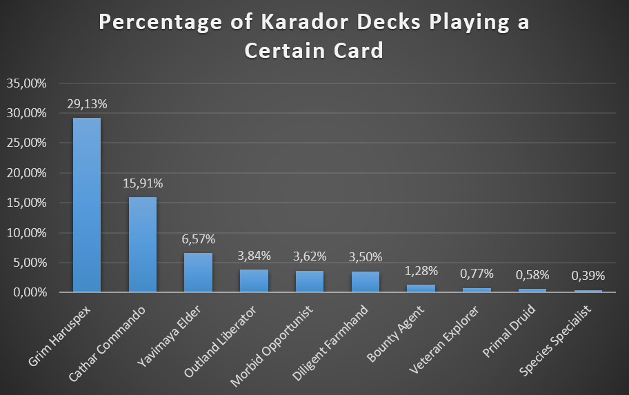 Lastly, we can get an idea of how much people are interested in Human strategies looking at Species SpecialistSpecies Specialist's inclusion rate. In fact, given how basically no one plays it, we can deduce that KaradorKarador is seldom built around any single creature type.