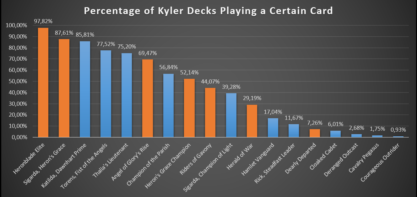 What's eye-catching in the graph is the absurd inclusion rate of certain cards, but I think they all have a precise reason behind it. In fact, I highlighted in orange the cards that were present in the Coven Counters preconstructed Commander deck. While said deck didn't feature KylerKyler as its commander, the card was present in the 99, and many decided to use it as a replacement for Leinore, Autumn SovereignLeinore, Autumn Sovereign. Still, many of the cards present in the original list work perfectly even with this alternative general, which lead people to keep on playing them after the switch as well. This easily explains why Heronblade EliteHeronblade Elite and Sigarda, Heron's GraceSigarda, Heron's Grace are basically omnipresent when looking at KylerKyler decks.