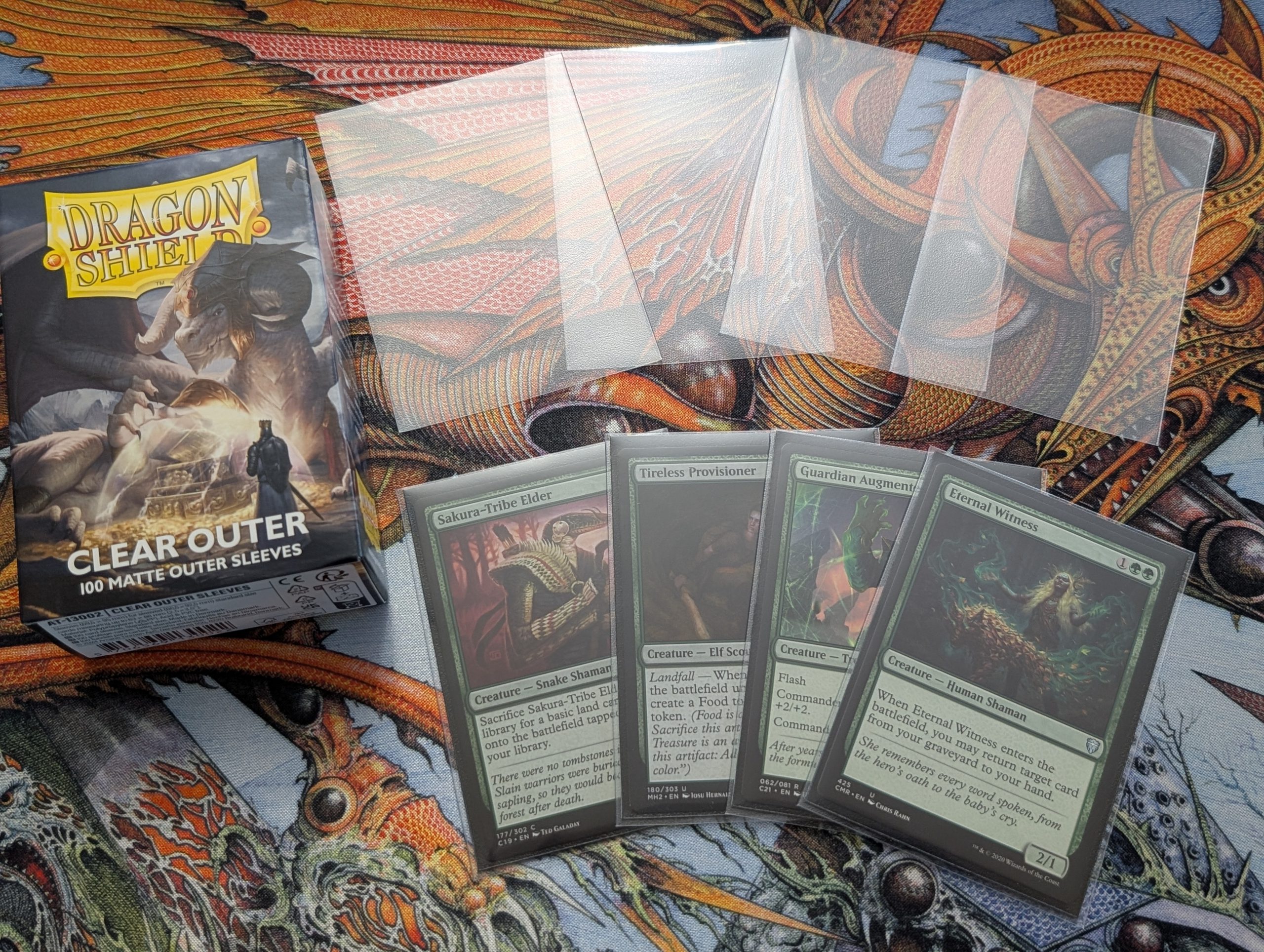 Clear Outer Sleeves by Dragon Shield. The top row is just the sleeves, and the bottom row is Magic cards in regular sleeves inside the Clear Outer Sleeves.