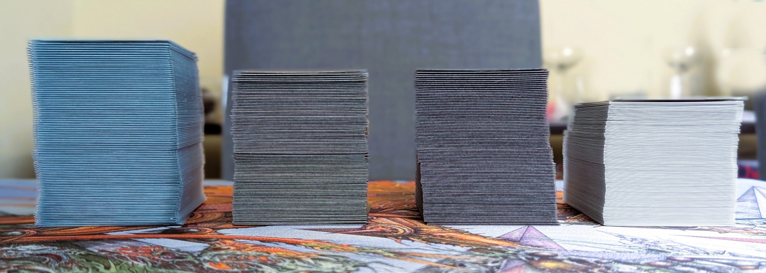 Thickness Comparison of double-sleeved cards. From left to right: cards sleeved in regular sleeves inside Clear Outer sleeves, cards inside Sealable Perfect Fit sleeves inside regular sleeves, cards inside Perfect Fit sleeves inside regular sleeves, and single-sleeved cards for comparison.