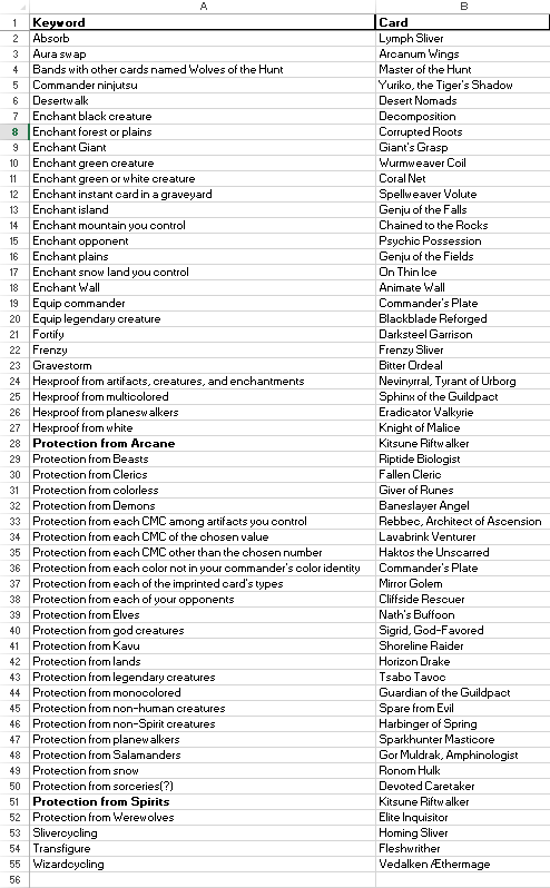 So of course, coming to this first hurdle, I immediately gave up and moved on to the next idea on the list. If I wanted to do the hard work, I wouldn't be making top ten lists, right? I did take the time to advise Jack of the failure of his entire idea, however, and I guess he took it kind of personally, because he then went ahead and told me that I had misunderstood the whole premise, I was stupid, and spent two days researching the whole list of actual single-use mechanics himself. (Editor's note: the vast majority of the work was completed in an hour, I just got lazy on things like "bands with *" and "protection from such-and-such CMC", but then I had some time to kill the next day, so I wrapped up the list.)