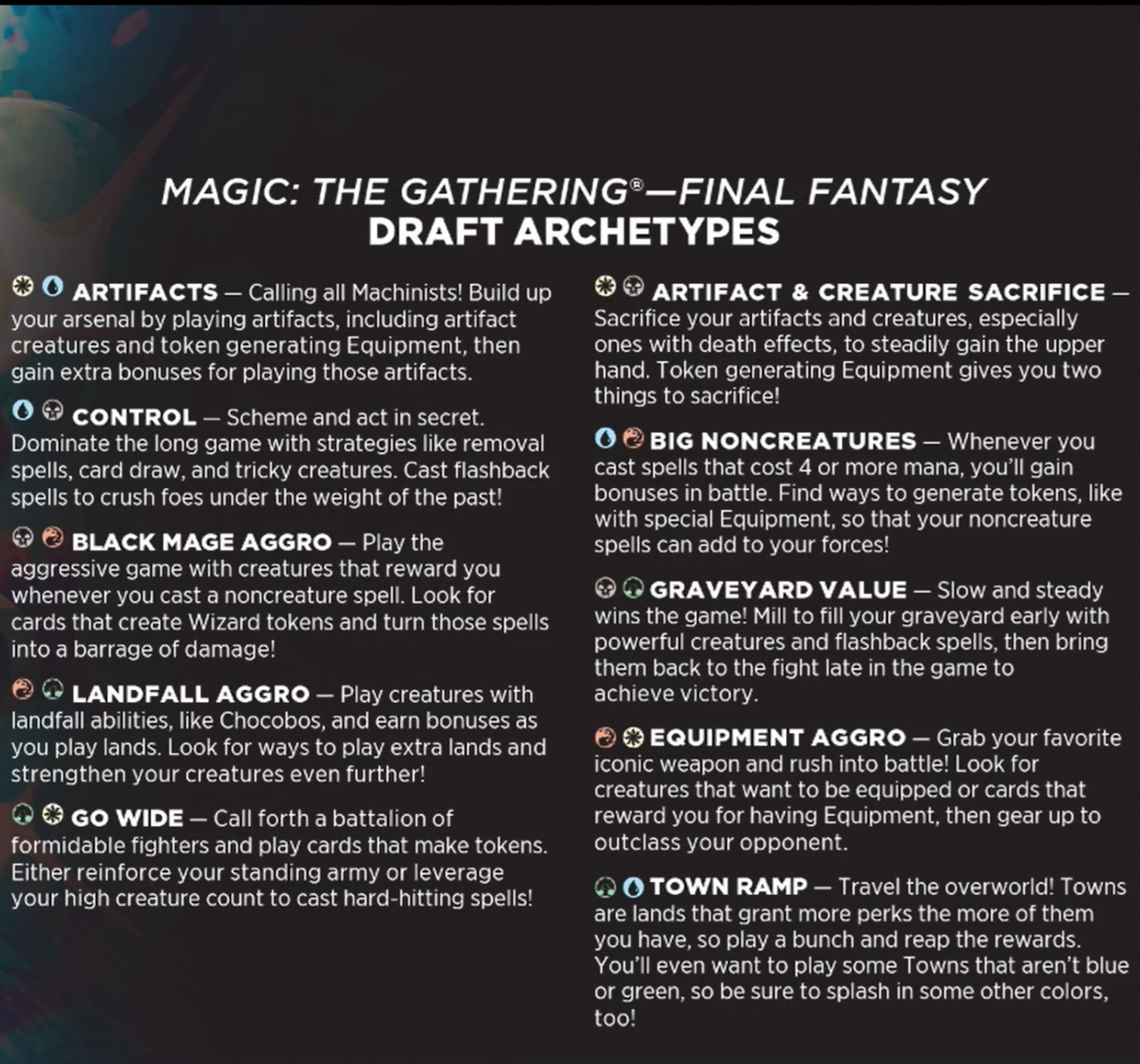 Once the previews were out of the way, WeeklyMTG host Blake Rasmussen detailed the Limited archetypes for Final Fantasy with his guests, Gavin Verhey, Head Designer for the set, and Dillon Devenny, the set's Narrative Lead. That list is outlined in the infographic below, which you'll also see in Play Booster Boxes as an insert:
